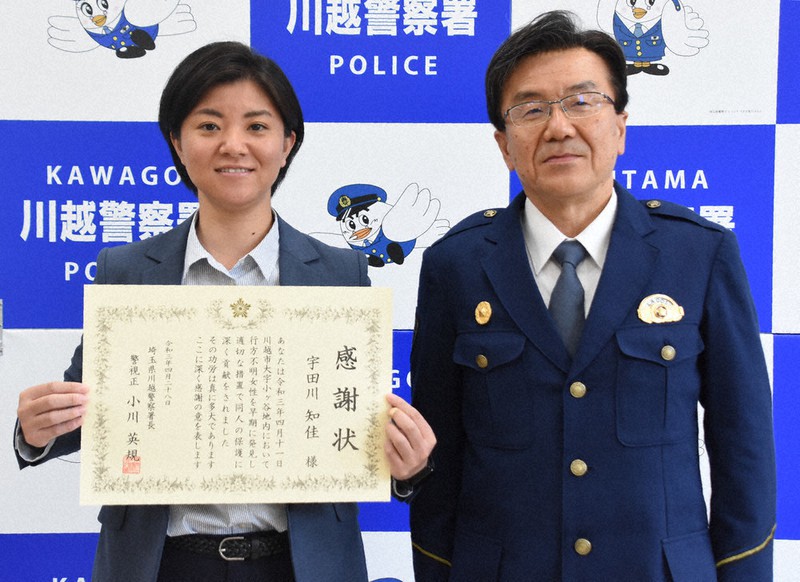 同署などによると、宇田川さんは4月11日昼前、川越市小ケ谷でランニング中、橋の上でたたずむ30代女性を見かけた。肌寒い日だったが、薄着で橋の下を見つめていたことが気になった。いつものコースを往復して再び橋に戻った午後0時25分ごろ、女性はまだ同じ場所にいた。意を決して「大丈夫ですか」と声をかけると、女性は「大丈夫です」。しかし、直後に防災無線が流れ、女性に似た特徴の行方不明者がいることを知った。「ご家族が探してますよ」。再び女性に声をかけ、110番通報した。
